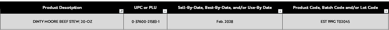 Hormel Food Sales, LLC: Dinty Moore Beef Stew - 20-OZ Jun 2 Written By Parminder Dhillon Affected Banner(s):Save Mart, Lucky, and FoodMaxx Affected Store(s):All Product Details: Learn more Parminder Dhillon