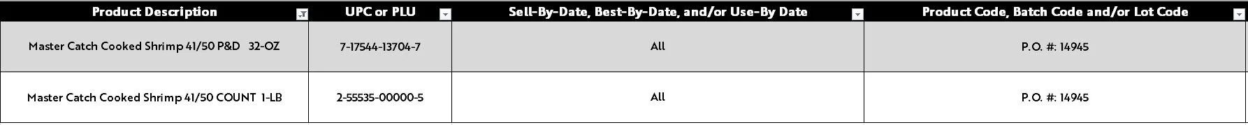 Southwind Foods / Great American Seafood Imports Company: Master Catch Cooked Shrimp Oct 3 Written By Parminder Dhillon Affected Banner(s):Save Mart, Lucky, and FoodMaxx Affected Store(s):All Product Details: Learn more Parminder Dhillon